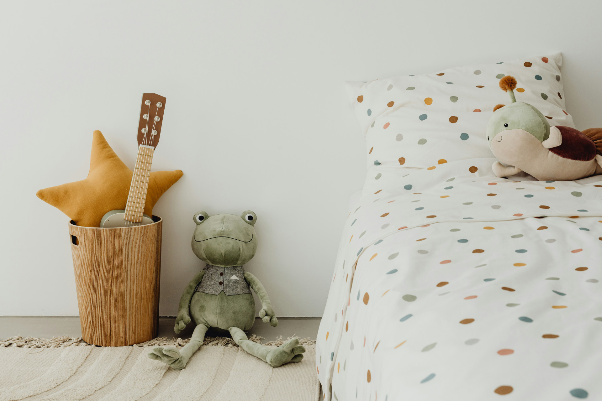 Färg och mönster hör hemma i ett barnrum, men de behöver inte dominera. Låt i stället textilier och tillbehör stå för det lekfulla.